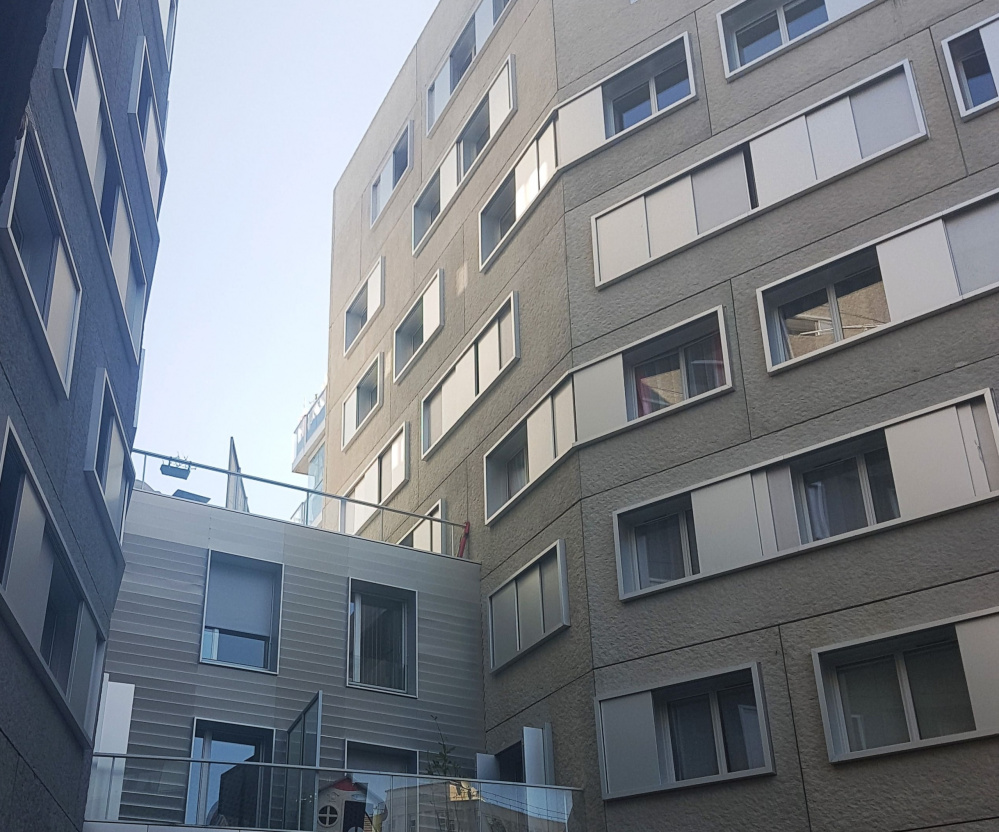 Sur 5 immeubles de 6 niveaux, Maine Fermetures a pris en compte la demande précise de l’architecte et a ainsi conçu et fabriqué des volets coulissants sur encadrement, avec une homogénéité entre les encadrements et les panneaux, aucune fixation apparente, et l’ensemble en anodisé naturel.